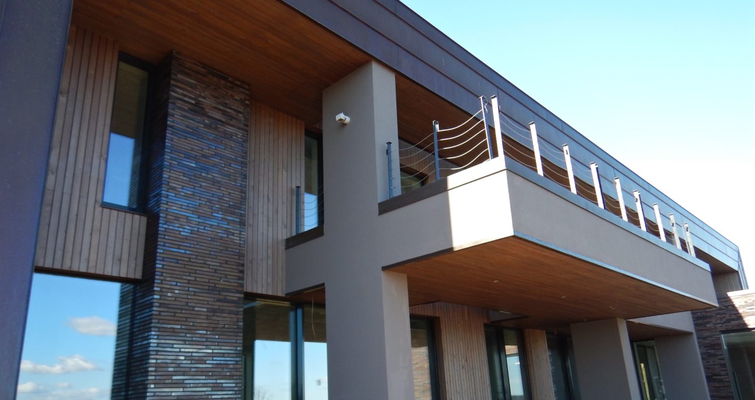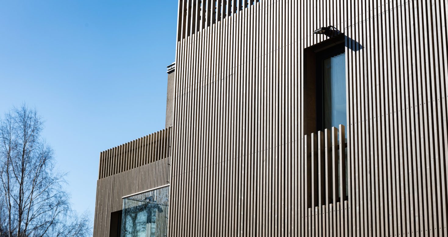 Fasādes koka paneļu papildus aizsardzībai pret mitruma un UV starojuma ietekmi uzklāts ADLER Pullex Protector – ar nanotehnoloģijām veidots caurspīdīgs ūdeni atgrūdošs produkts. Privātmāja Rīgā.