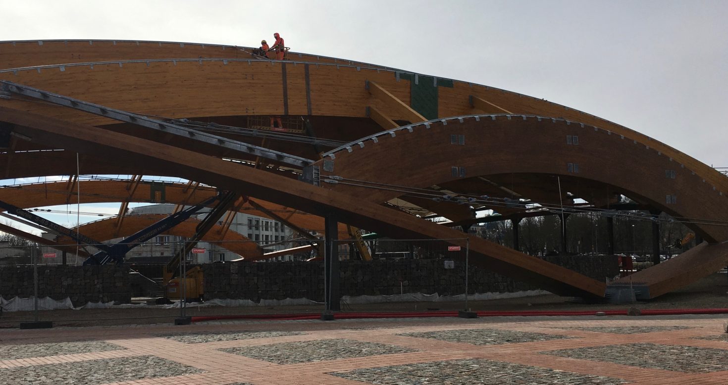 Unikālā Jelgavas estrādes jumta koka konstrukcija krāsota ar ADLER Pullex Plus lazūru.